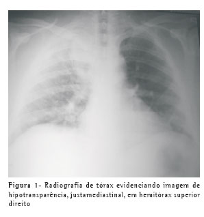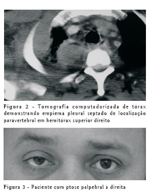 A radiografia de tórax, no momento da internação, evidenciou imagem de hipotransparência no terço superior do hemitórax direito (Figura 1). A tomografia computadorizada do tórax demonstrou imagem sugestiva de empiema pleural septado localizado em região paravertebral superior, no hemitórax direito (Figura 2). O paciente foi submetido à toracotomia exploradora póstero-lateral, em caráter de urgência, com drenagem das lojas empiemáticas e descorticação pulmonar. Permaneceu em ventilação mecânica por seis dias, recebendo alta da unidade de terapia intensiva no décimo dia de pós-operatório, com evolução satisfatória e regressão do quadro infeccioso. Após o desmame da ventilação mecânica e a extubação do paciente, quando ele estava consciente, foi observada a presença de ptose palpebral à direita. O paciente percebeu essa ptose no quinto dia após o início da instalação do quadro clínico e antes da internação hospitalar, fato confirmado por seus familiares (Figura 3). O paciente recebeu alta hospitalar no décimo quarto dia após a cirurgia, em bom estado geral. Durante o acompanhamento ambulatorial pós-operatório, o paciente apresentou, após dois meses, regressão total da ptose palpebral.