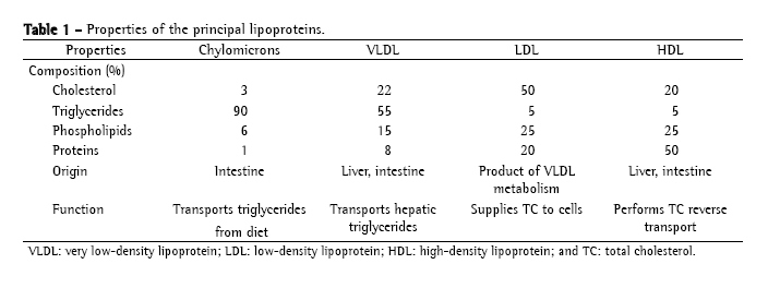 Lipoproteins are classified according to their electrophoretic mobility and density (the greater the quantity of apoproteins, the greater the density, and the greater the quantity of TG, the lower the density).(9) The principal lipoproteins are the following: chylomicrons (CM), very low-density lipoprotein (VLDL), intermediate density lipoprotein, low-density lipoprotein (LDL) and high-density lipoprotein (HDL). Table 1 shows the properties of the principal lipoproteins.