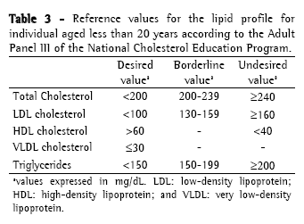 Approach to cystic fibrosis-related dyslipidemiaScreening and diagnosisThere is no specific recommendation for screening and laboratory testing diagnosis of CFD. Therefore, the orientations and reference values are extrapolated from the guidelines of the National Cholesterol Education Program, 1992(36) and from the Brazilian Cardiology Society, 2005(37) for children (Table 2); and from the recommendations of the Adult Panel III of the National Cholesterol Education Program(38) (Table 3) for adults. The reference values suggested by the Brazilian Cardiology Society for individuals aged less than 19 years differ from those of the National Cholesterol Education Program, since it proposes lower values of CT, LDL and TG.