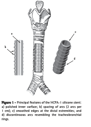 MethodsStent designThe silicone stent described here has been designated the HCPA-1 stent and is a modified version of the Dumon model.(10) The purported improvements are as follows: an external surface covered with discontinuous protruding arcs resembling the tracheobronchial rings (for intercalation and fixation in the lumen of the lower airways); a highly polished inner surface that prevents adhesion of dense mucus, blood or other materials from the respiratory tree; smooth extremities to decrease friction-related damage and the 'battering-ram' effect that can result from the impact of stent movement during breathing and coughing (Figure 1).