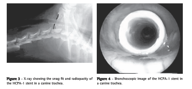 A common complication associated with the normal canine trachea is the displacement and consequent migration of the stent, due to the lack of obstacles to mucosal adherence. This was resolved in our study by the placement of an external suture. However, it should be borne in mind that, in the presence of stenosis, migration is less likely to occur.(5,8) In humans, Colt has also described the use of external sutures during stent placement in the upper portion of the trachea, which is more mobile.(13) However, we believe that suturing would rarely be required for fixation of the HCPA-1 stent.