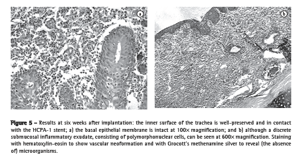 Results There were no remarkable postimplantation events or complications, and there were no cases in which the need to remove a stent arose. At eight weeks after implantation, the devices were found to be well-positioned (Figures 3 and 4). Histopathologic analysis of the tracheal specimens showed a well-preserved epithelial basal membrane. As shown in Figure 5, a small quantity of submucosal inflammatory infiltrate, consisting predominantly of polymorphonuclear cells, was frequently observed, together with sparse areas of granulation tissue and vascular neoformation. No microorganisms were detected.