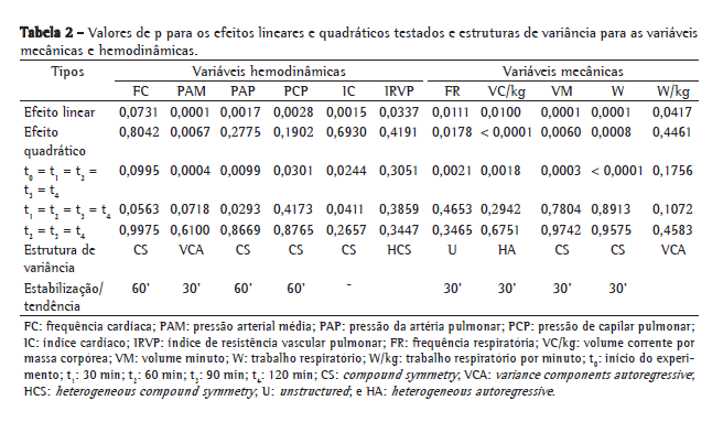 Os testes dos efeitos lineares e quadráticos nas variáveis hemodinâmicas revelaram-se presentes na PAM, que se estabilizou no t1. Na FC, PAP e PCP, apesar de não observarmos significância na análise dos efeitos lineares e quadráticos, houve uma forte aproximação dos valores obtidos entre os tempos t2, t3 e t4 (p = 0,9975, p = 0,8669 e p = 0,8765, respectivamente), o que sugere estabilização a partir de t2. Não observamos estabilização do IC e do IRVP. O valor p dos efeitos lineares e quadráticos e das comparações entre os tempos, os tipos de estrutura de variância e covariância encontrados e a estabilização ou tendência de cada uma das variáveis hemodinâmicas estudadas encontram-se na Tabela 2.