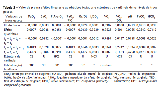 Os valores observados nos respectivos tempos são apresentados na Tabela 1. Para todas as variáveis, foram testados os efeitos linear e quadrático. Para aquelas variáveis que se ajustaram a esses efeitos, foram testadas as hipóteses de que não se diferenciavam para os tempos de t1 a t4 ou de t2 a t4, o que configuraria estabilidade aos 30 e 60 min, respectivamente. Todas as variáveis, com exceção da DO2, apresentaram distribuição paramétrica ao teste de Shapiro-Wilk.