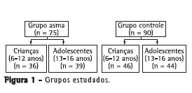 Ao subdividir cada grupo segundo a faixa etária, obtivemos 36 crianças e 39 adolescentes no grupo asma; e 46 crianças e 44 adolescentes no grupo controle.