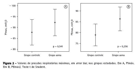 A avaliação da força dos músculos respiratórios (PImáx e PEmáx) em crianças e adolescentes asmáticos não foi diferente da observada em indivíduos controles, pareados por gênero e idade. À semelhança do observado por outros autores, apesar de terem obstrução ao fluxo aéreo, constatada pela redução significante no VEF1, os asmáticos não tiveram comprometimento na força dos músculos respiratórios.(29,30)