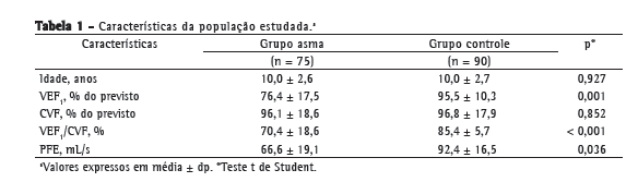 Foram avaliados 217 crianças e adolescentes, dos quais 165 foram incluídos no estudo, sendo 75 pacientes com asma e 90 controles (Figura 1). Eram do gênero masculino 41 indivíduos (54%) no grupo asma e 43 (47%) no grupo controle. A Tabela 1 apresenta algumas características da população estudada.