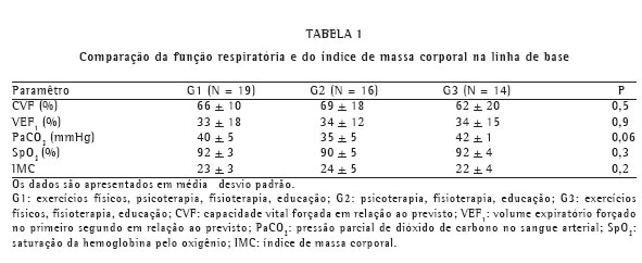 As comparações entre os grupos, no que diz respeito às variáveis espirométricas, de gravidade da DPOC e do índice de massa corporal estão demonstradas na Tabela 1. Houve predominância do sexo masculino (73%) e da raça branca (93%). Todos os pacientes tinham mais de 50 anos, 69% eram casados, 8% eram analfabetos e 71% tinham nível de instrução primário. Tinham rendimento mensal maior do que três salários mínimos 55% dos pacientes. Todos faziam uso de medicação, principalmente beta-2-agonistas inalatórios (90%), ipratrópio (67%), corticosteróides sistêmicos e/ou inalatórios (57%) e xantinas (51%). Oxigenoterapia domiciliar era utilizada por 8% dos pacientes, antidepressivos por 10% e ansiolíticos por 6% deles. As doenças associadas de maior freqüência foram: hipertensão arterial sistêmica (20%), cardiopatia isquêmica (18%) e diabetes melito (16%). Cinco indivíduos mantinham o hábito tabágico ao iniciar o PRP (10%). Os pacientes não apresentaram distúrbios nutricionais graves. As médias do índice de massa corporal e dos eletrólitos séricos relacionados à função muscular respiratória foram normais. As médias das medidas espirométricas em relação ao previsto foram capacidade vital forçada de 66% e volume expiratório forçado no primeiro segundo de 34%. Em média, os pacientes não eram policitêmicos e nem hipercápnicos, mas apresentavam hipoxemia (saturação da hemoglobina pelo oxigênio de 91%).