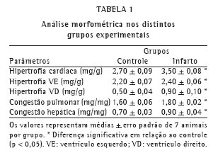 Houve diferenças estatisticamente significativas entre os grupos em relação aos índices de hipertrofia cardíaca, e hipertrofias ventriculares esquerda e direita. A Tabela 1 mostra esses índices, assim como as relações peso úmido/peso seco para pulmões e fígado, que também estavam aumentadas no grupo infarto em relação ao controle.