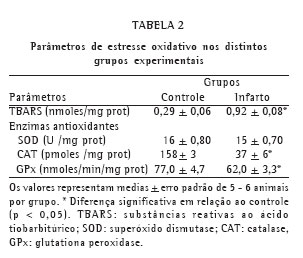 Os resultados relacionados às análises de estresse oxidativo são mostrados na Tabela 2. Esses resultados indicam que a peroxidação lipídica, avaliada pelo método das substâncias reativas ao ácido tiobarbitúrico, estava significativamente aumentada no grupo infarto em comparação com o grupo controle (217%). As atividades da glutationa peroxidase e da catalase estavam 20% e 77% reduzidas no grupo infarto em relação ao grupo controle, respectivamente. O infarto não modificou a atividade da superóxido dismutase.