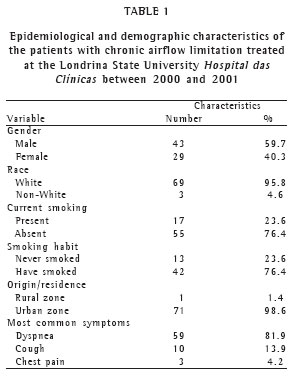 We evaluated all of the patients with CAL, diagnosed according to the criteria established by the Brazilian Society of Pulmonology and Phthisiology,(9) who were treated at the HC/UEL between January 1, 2000 and December 31, 2001, who presented pulmonary alterations (functional, radiological, or both), and who agreed to participate in the study.