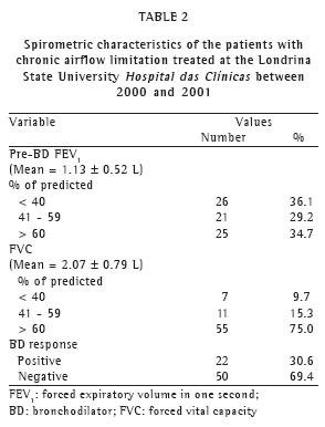 Some authors,(12) studying a similar sample, also demonstrated similar means. The only divergent spirometric value between the present study and the above-mentioned study was the number of positive bronchodilator test results. In the present study,(14) 22 patients (30.60%) presented positive bronchodilator test results (200 mL or 12% of variation), compared with only 5.7% in the above-mentioned study. Despite this divergence regarding the positive response to the bronchodilator, all of the patients of the present study presented FEV1 values below 70% after the bronchodilator test. In another study analyzing 22 patients with CAL, a mean FEV1 of 0.9 L or 38% of predicted was also found. In a book on respiratory medicine, it was stated that up to 30% of patients with CAL present a positive bronchodilator response. These data can be compared because the present study used criteria for definition and diagnosis that were the same as those cited by the authors in their book.
