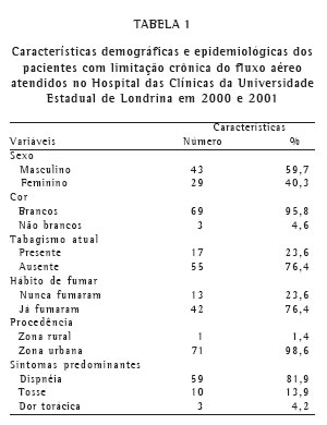 Quanto ao diagnóstico clínico da doença de base, 19 deles eram asmáticos graves (26,5%), 40 eram portadores de bronquite crônica (55,6%) e 13 eram enfisematosos (18,1%). O estadiamento clínico por gravidade destes pacientes mostrou 23 (31,9%) pacientes com estádio I (leve), 23 (31,9%) com estádio II (moderado), e 26 (36,1%) com estádio III (grave).