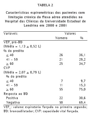 Todos os pacientes apresentavam a razão entre o VEF1 e a capacidade vital forçada abaixo de 90% do esperado. A média dessa razão foi de 65,3% do predito com desvio-padrão de 18,2. Vinte e dois pacientes apresentaram prova de broncodilatação positiva (30,6%), que se caracterizava por uma melhora funcional no VEF1 de 12% e/ou 200 ml após o uso de 200 mcg de salbutamol spray (Tabela 2).