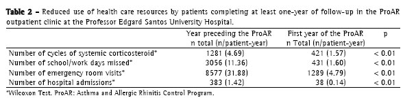 Table 2 demonstrates that, among the patients who had been monitored in the program, the number of cycles of systemic corticosteroids was reduced to one-third of that registered in the previous year, and that the numbers of school/work days missed, emergency room visits and hospital admissions for asthma attacks were reduced to approximately oneninth of those reported for the previous year. There was a significant reduction in the outcomes evaluated, both from the statistical point of view as well as from the clinical point of view. Over 7000 emergency room visits and over 300 hospital admissions were prevented. It is worth mentioning the ratio of the number of emergency room visits to the use of systemic corticosteroids. Before the ProAR followup treatment, the ratio was six emergency room visits to each corticosteroid cycle, and after the ProAR follow-up treatment, this ratio dropped to three visits to one cycle.