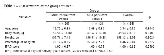 ResultsThe anthropometric characteristics were similar among the three groups studied (mild intermittent asthma, mild persistent asthma, and control), as were the physical activity characteristics. As shown in Table 1, ANOVA showed no statistically significant differences among the groups regarding age, body mass, height, or percentage of body fat; in addition, the Kruskal-Wallis test showed no statistically significant differences among the groups regarding the level of physical activity, as measured by the IPAQ score.