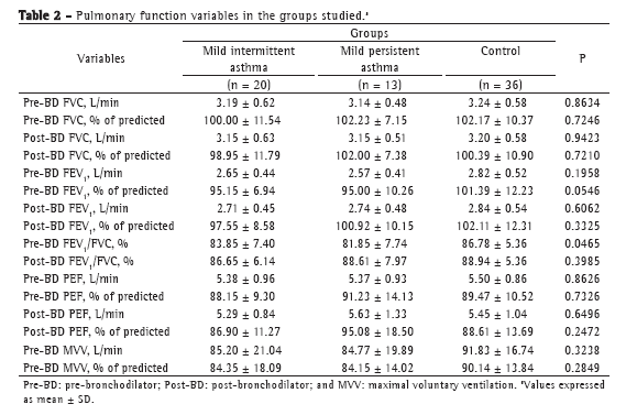 Finally, judging from the final result obtained, the period between attacks was clinically well characterized and well selected in the present study. This allowed group homogeneity, which is required to compare individuals with asthma of varying severity and those without in terms of their aerobic capacity. As a result, there were no statistically significant differences between the patients with mild intermittent asthma and those with mild persistent asthma or between the asthma patients and the controls in terms of the spirometric values. This demonstrates that the classification of asthma severity is not supported by the functional variables investigated during the period between attacks. Therefore, the limitations imposed by the criteria for determining asthma severity(3) in the period between attacks do not allow functional differentiation between patients with mild intermittent asthma and those with mild persistent asthma. It could be argued that there are no differences, given that both groups of patients are clinically equal. However, this is not supported by the literature; the results of studies on this topic refer to study groups rather than populations and are discrepant.(5)