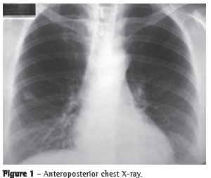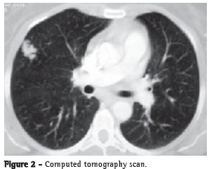 A 57-year-old Caucasian female (born in the city of Juiz de Fora, in the state of Minas Gerais, married, and a retired teacher) was referred to the SPCT-HMS-JF because the X-ray (Figure 1) prior to cholecystectomy revealed a nodule (of unknown stability and with irregular borders) in the right pleural cavity. The patient, who was totally asymptomatic, was a smoker (20 pack-years) and had a family history of cutaneous amyloidosis.