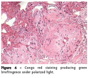 There have been few reported cases of systemic AA amyloidosis affecting the lungs. However, the AL type has been a unanimous finding in studies of fibrillary protein sequencing. Autopsy series have confirmed that diffuse amyloidosis of the lung parenchyma is the most common histological type of systemic AL amyloidosis. The clinical characteristics rarely lead to confusion with pulmonary edema or fibrosis. Advanced lung disease is not related to hereditary amyloidosis.(3) In the primary systemic form, amyloid fibrils can occur at other sites, such as in the heart, kidneys, tongue, gastrointestinal tract, blood vessel walls, nerves, skin, muscles, and peri-articular structures. Of the patients with this form of the disease, 10-15% present concomitant multiple myeloma.(4) The great majority of patients with pulmonary impairment present the primary form of the disease.(1,4)