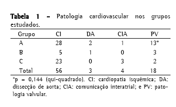 As patologias cardiovasculares que originaram o tratamento cirúrgico nos grupos estudados estão listadas na Tabela 1. Observamos um maior número de infecções em cirurgias devido à patologia valvular no grupo A, mas sem diferenças estatisticamente significativas (p = 0,144).