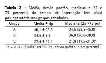 A média com o desvio padrão e a mediana com o 25 e 75 percentis do tempo de internação pós-operatória podem ser vistas na Tabela 2. O tempo de internação pós-operatória foi menor no grupo C, e estatisticamente significativo (p = 0,046).