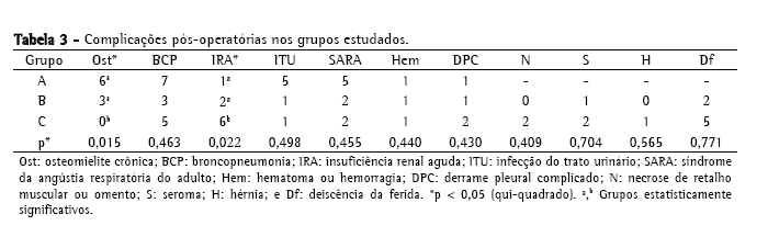 Definiu-se como mortalidade quando o óbito foi diretamente relacionado com a infecção da ferida esternal, ou quando este ocorreu no período de 30 dias após a reconstrução. As complicações a serem consideradas foram: broncopneumonia, insuficiência renal aguda (IRA), infecção do trato urinário, síndrome da angústia respiratória do adulto (SARA), derrame pleural complicado, sangramento e área de osteocondrite com trajeto fistuloso. Seroma, hematoma, desvascularização parcial ou total do retalho, deiscência da ferida, hérnia abdominal e infecção de parede abdominal foram considerados para os grupos B e C, pois são inerentes às técnicas empregadas.