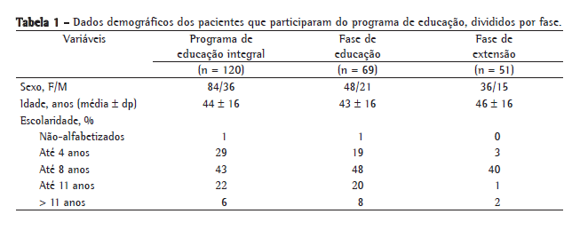 Foram selecionados 164 pacientes, correspondendo aproximadamente a 15% dos pacientes registrados no ambulatório de asma, durante um período de 24 meses (Figura 1). Destes, 39 pacientes (23%) não retornaram ao programa de educação, 1 paciente foi encaminhado para atendimento em outra especialidade, 2 obtiveram alta do ambulatório e 2 evoluíram a óbito no início do estudo. Dessa forma, 120 pacientes (73%) foram submetidos à fase de educação (três visitas), e 51 (31%) retornaram para a reavaliação na fase de extensão, completando o total de quatro visitas do programa. A média de idade foi de 44 anos (variação, 14-82), sendo que 84 pacientes (70%) eram do sexo feminino e 36 (30%), do sexo masculino. Não houve diferenças em relação ao sexo, idade e escolaridade entre os pacientes que completaram o programa de educação (Tabela 1). A maioria dos pacientes (43%) possuía até 8 anos de educação formal. Durante a fase de educação, o intervalo entre as visitas foi de 4 meses e, na fase de extensão, o intervalo (entre V3 e V4) foi de 12 meses, aproximadamente.