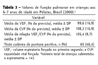 A prevalência de asma e sintomas respiratórios é apresentada na Tabela 2, e os valores de função pulmonar são apresentados na Tabela 3. A prevalência de diagnóstico médico de asma atual em crianças de 6 a 7 anos de idade foi de 12,8%. Entretanto, nos últimos 12 meses, 16,8% das crianças tinham apresentado sibilância, e 3,6% haviam tido pelo menos quatro episódios de sibilância. Os valores de função pulmonar estavam dentro da faixa de normalidade para todas as crianças estudadas. Para a identificação de qualquer potencial viés de seleção, as 143 crianças que foram submetidas aos testes foram comparadas a todas as outras crianças da coorte com base nos dados coletados no momento do nascimento. As crianças testadas não diferiram significativamente do restante da coorte em relação à cor da pele, sexo, renda familiar, escolaridade materna, nascimento prematuro, baixo peso ao nascer e tabagismo materno durante a gravidez (dados não mostrados).