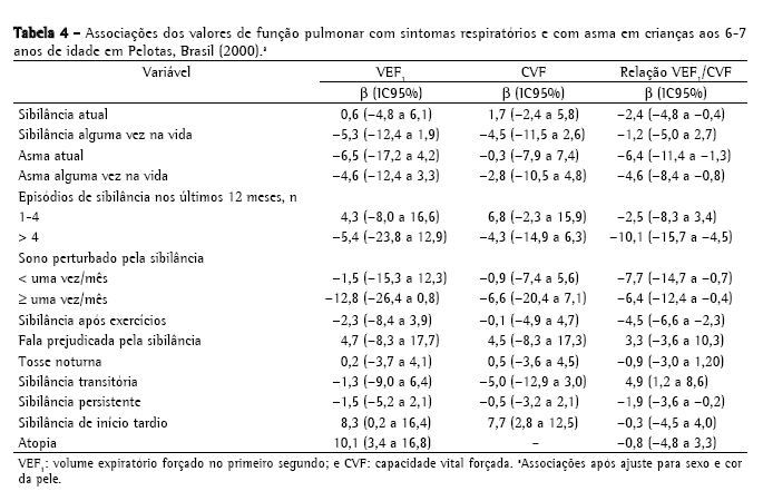 A Tabela 4 mostra os resultados da regressão linear realizada para cada valor de função pulmonar e cada sintoma respiratório. As associações estatísticas foram ajustadas para sexo e cor da pele. As crianças com asma grave-definida como presença de pelo menos quatro episódios de sibilância nos últimos 12 meses, fala prejudicada pela sibilância e sono perturbado pela sibilância-apresentaram menores valores de função pulmonar, assim como as crianças com sibilância persistente. A média da relação VEF1/CVF foi menor nas crianças com sibilância atual e asma, asma alguma vez na vida, pelo menos quatro episódios de sibilância nos últimos 12 meses, sono perturbado pela sibilância e sibilância após exercícios.