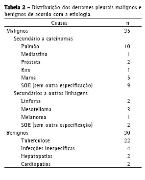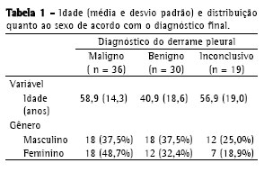 A Tabela 1 mostra a distribuição quanto à idade e sexo dos pacientes. O diagnóstico etiológico dos derrames pleurais, encontra-se no Tabela 2.
