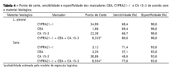 A sensibilidade e especificidade de cada marcador estão representadas na Tabela 4. Os pontos de corte foram escolhidos a partir das curvas ROC de cada um deles, sob a condição de que a especificidade fosse ≥ 90%. Sob essa condição, verifica-se que, no líquido pleural, os marcadores CYFRA21-1 e CEA juntos atingiram, ambos, a maior sensibilidade (69,4%). Quando os três marcadores foram combinados, a sensibilidade aumentou para 80,6%.