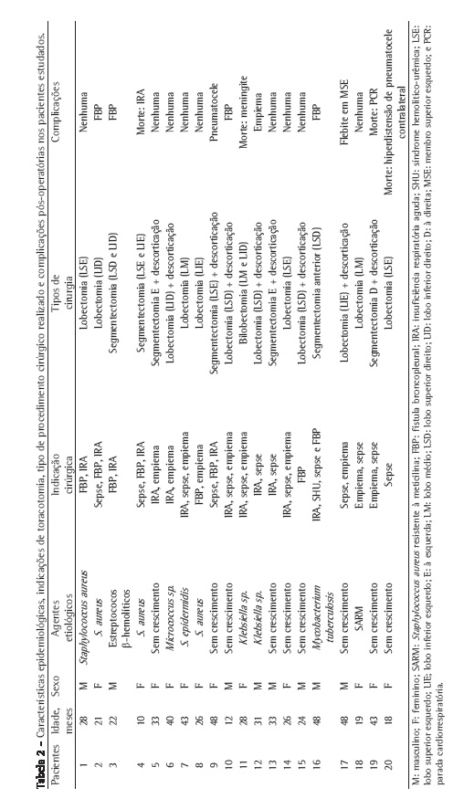 O agente etiológico foi identificado em 11 pacientes (55%), por meio da cultura de líquido e resíduos pleurais, sendo os seguintes agentes mais comuns: Staphylococcus aureus, em 5 casos (25%), e Klebsiella sp., em 2 (10%). Os outros agentes identificados foram Micrococcus sp., estreptococos β-hemolíticos, Staphylococcus epidermidis e Mycobacterium tuberculosis, sendo esse último identificado pelos achados histopatológicos da peça ressecada (Tabela 2).