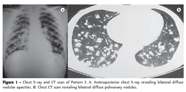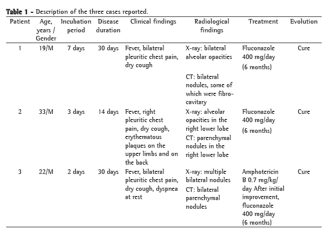 The comparison between the three cases reported here and the other cases reported in the literature revealed that the pattern of pulmonary manifestations was basically the same: diffuse pneumonia,(12) with different degrees of severity, and concomitant cutaneous dissemination, which is the most common extrathoracic form (one patient).(18) The radiological (X-ray and CT) findings were similar. Some invasive methods for making the diagnosis, such as lung biopsy(6) and lobectomy,(5) have been described in the literature. However, in the case of our patients, the use of such methods was not necessary, since the clinical profile, the imaging findings and the serology results were sufficient to confirm the diagnosis.