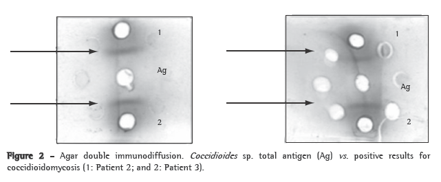The diagnosis is clinical, epidemiological and laboratorial. Laboratorial diagnosis is made based on the identification of the parasite in a direct mycological examination (sputum, pus, cerebrospinal fluid, bronchoalveolar lavage, skin lesion scraping and biopsy) or in a swab culture on Sabouraud agar medium.(4) Unfortunately, culture identification is slow and often impossible, since many patients with primary pulmonary infection are not able to expectorate secretion. Histopathological diagnosis can also be disadvantageous, since invasive sampling procedures can be dangerous. Therefore, the serologic tests developed by Smith (1948) are valuable in the diagnosis and follow-up treatment of patients with suspected coccidioidomycosis, particularly double immunodiffusion, which was established by Huppert & Bailey (1965) and is performed according to the Ouchterlony technique.(14) This technique is reliable and specific, as well as presenting few cross-reactions. It constitutes a qualitative test, since only an approximate quantification can be obtained by using serum dilutions in the study and by observing the maximum serum dilution forming precipitation bands against the antigen. This technique is less costly and more practical, as well as requiring only 24-72 h, thereby facilitating the institution of early and appropriate treatment.(10,15)