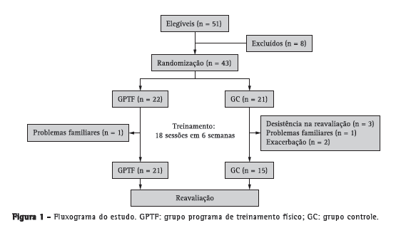 Foram recrutados 51 pacientes de ambos os gêneros com diagnóstico clínico de DPOC; no entanto, 8 pacientes foram excluídos: 4, por apresentar obstrução leve; 2, por não participar de todas as avaliações; e 2, por indisponibilidade de seguimento do programa de tratamento proposto. Assim, permaneceram 43 pacientes do sexo masculino no estudo. Inicialmente, os grupos PTF e controle foram compostos, respectivamente por 22 e 21 pacientes; porém, somente 21 e 15 pacientes, respectivamente, finalizaram o estudo (Figura 1).