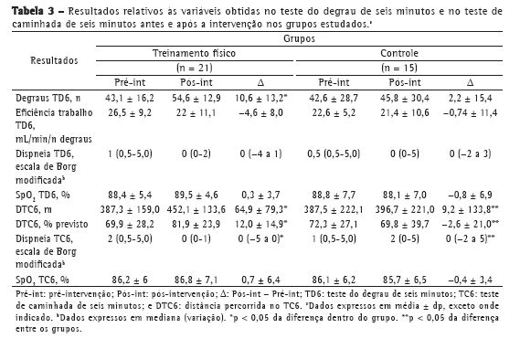 Os princípios gerais do TD6 foram baseados nas recomendações estabelecidas pela American Thoracic Society,(13) e a capacidade funcional no TD6 foi registrada pelo número total de subidas no degrau com os dois pés, bem como pelo cálculo do trabalho (VO2/número de subidas no degrau).