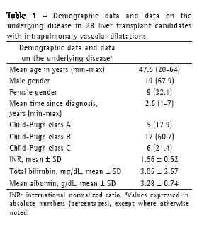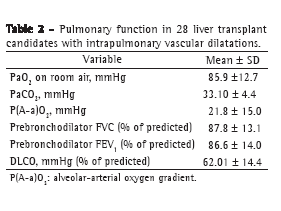 IntroductionHepatopulmonary syndrome, which consists of the triad of intrapulmonary vascular dilatations (IPVD), hypoxemia and liver disease, has been described in 5-29% of individuals with liver disease. Occurring in 5-47% of all cases of advanced liver disease, IPVD constitute the leading cause of severe hypoxemia in such cases.(1-6) However, not all patients with IPVD present hypoxemia; the clinical significance and prognosis of IPVD in the absence of gas exchange abnormalities remain undefined.(7)