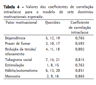 O grau de concordância entre os fatores motivacionais obtidos nas duas ocasiões, empregando-se os modelos teóricos de artigos previamente publicados, também foi elevado.(8-10) Os valores dos CCI obtidos foram ­superiores a 0,7 em seis dos sete domínios, valor que denota excelente concordância (Tabela 4).(18)