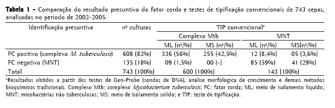 Das 743 cepas estudadas, 608 (81,8%) foram identificadas como pertencentes ao complexo M. tuberculosis pela presença do fator corda; destas, 591 (97,2%) foram confirmadas pelos testes de tipificação convencionais e 17 (2,8%) foram identificadas como micobactérias não tuberculosas (MNT). As espécies identificadas a partir dos métodos convencionais, isoladas em meio líquido e sólido, relacionadas quanto à presença ou ausência do fator corda, podem ser verificadas na Tabela 2.