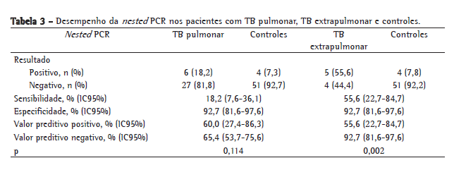 Para a avaliação do real desempenho da nPCR, considerando a limitação do padrão ouro inerente à confirmação da doença na faixa pediátrica, foi incluído no grupo controle também o grupo de pacientes em que a TB foi descartada apesar de serem considerados inicialmente suspeitos. A sensibilidade da nPCR obtida foi de 26,15%, e a especificidade foi de 92,73%. Considerando a forma da doença, a sensibilidade para a TB extrapulmonar foi de 55,56% e, para a TB pulmonar, 18,18% (Tabela 3).