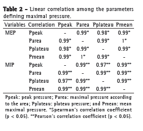 The calculation of linear correlations among the variables showed that the variables were strongly correlated, with values above 0.9 (Table 2). In fact, given that the different parameters studied were derived from the same pressure curve, it is not surprising that they were found to be strongly correlated. These results are consistent with the reported Ppeak and Pplateau values for MIP.(12) According to the authors of that study, the strong correlation between the two variables suggests that they are interchangeable. However, as was reported in that study,(12) the parameters, although strongly correlated, were statistically different from one another, indicating that choosing one over the other might influence the characterization of respiratory muscle strength in the individuals evaluated.