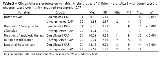 DiscussionThe present study described the characteristics of patients who were diagnosed with complicated or uncomplicated CAP and who were admitted to the pediatric wards of two university hospitals in the metropolitan area of Campinas. We sought to identify variables associated with the development of complications and to determine whether epidemiological or clinical conditions played a role in this unfavorable outcome. The most common complication was pleural effusion, a finding that is consistent with those of other authors.(12,14,17,18)