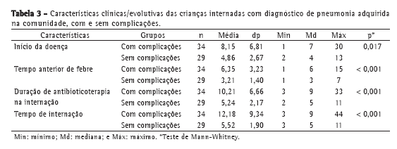 Em relação aos antecedentes (Tabela 2), houve diferenças estatisticamente significantes entre os grupos quanto a pneumonia anterior (p = 0,03) e antibioticoterapia prévia (p = 0,004). Em relação às características clínicas/evolutivas, o tempo de início da doença (p = 0,01), duração da febre antes da internação (p < 0,001), duração da antibioticoterapia (p < 0,001) e tempo de internação (p < 0,001) também apresentaram significância estatística (Tabela 3).