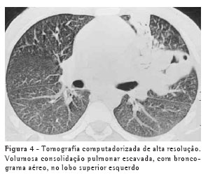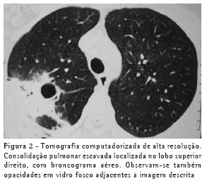 Na nossa casuística, o principal padrão de acometimento pulmonar foi o de consolidação com broncograma aéreo de permeio e escavação, presente em 6 pacientes, sendo as escavações múltiplas em 5 casos e única em 1. As consolidações tinham grandes proporções e contornos anfractuosos. Os broncogramas aéreos estavam localizados nas porções periféricas das lesões. O lobo pulmonar mais freqüentemente envolvido foi o lobo superior direito, acometido em 4 pacientes. A maioria dos trabalhos de revisão de casos confirma tais achados.(2,5) Alguns trabalhos relatam que, embora a escavação possa não estar presente no momento do diagnóstico, ela acaba por se desenvolver durante a evolução da doença.(4) Níveis líquidos no interior das escavações foram vistos em apenas um paciente na casuística estudada.