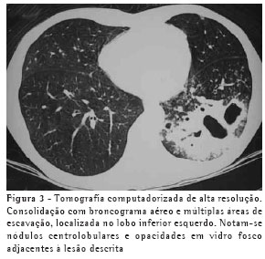 Outros achados foram as opacidades em vidro fosco, os nódulos do espaço aéreo, os pequenos nódulos de distribuição predominantemente centrolobular, e o padrão de árvore em brotamento. Eles se localizavam predominantemente ao redor das consolidações escavadas, sendo que em um dos casos também estavam presentes em ambos os lobos inferiores. Acredita-se que tal achado deva representar disseminação broncogênica da infecção.