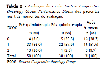 Na avaliação pós-quimioterapia, os resultados mostraram um aumento do número de pacientes assintomáticos: 15 pacientes (39,5%) apresentavam ECOG = 0; 22 (57,9%) apresentavam ECOG = 1; e apenas 1 (2,6%) apresentou ECOG = 2. Após seis meses, observa-se uma frequência semelhante aos resultados obtidos após os quatro ciclos de quimioterapia (Tabela 2).
