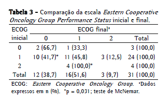 Entretanto, 14 (45,2%) pacientes apresen­taram melhora do SP (de ECOG inicial = 1 para ECOG = 0 após a quimioterapia) e 4 melhoraram de ECOG = 2 para ECOG = 1 (Tabela 3).