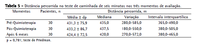 Quanto à variação da distância percorrida no TC6 na avaliação inicial, após a quimioterapia e seis meses após a primeira avaliação, essa foi de, respectivamente, 280-585 m (média ± dp = 431,5 ± 75,9 m), 180-550 m (média ± dp = 437 ± 79,6 m) e 280-585 m (média ± dp = 431,5 ± 74,1 m), salientando que um dos pacientes se recusou a realizar a avaliação final do TC6. Essas diferenças não foram estatisticamente significantes (p = 0,781; Tabela 5).