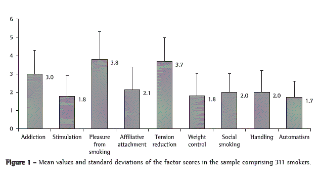 Because the Cronbach's alpha coefficient for factor 9 was low, a decision was made to reintroduce question 8, which had shown a factor weight of 0.333, into this factor, for the purpose of achieving better internal consistency. The Cronbach's alpha coefficients for this new factor 9 and for the overall scale were, respectively, 0.54 and 0.83. The final composition of the new scale, with the appropriate denominations for the factors and the selected items (questions), was as follows: Factor 1-addiction (questions 6 and 26); Factor 2-stimulation (questions 1, 11, and 20); Factor 3-pleasure from smoking (questions 4 and 13); Factor 4-affiliative attachment (questions 7 and 21); Factor 5-tension reduction (questions 5, 15, and 25); Factor 6-weight control (questions 17 and 28); Factor 7-social smoking (questions 9 and 19); Factor 8-handling (questions 2 and 12); and Factor 9-automatism (questions 8, 18, and 27). The mean values and the respective standard deviations of the scores observed in the sample of 311 volunteers are illustrated in Figure 1.