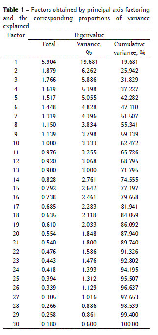 The total factor variance and the eigenvalues obtained by factor analysis are reported in Table 1. Ten factors explained 62.5% of the total variation.